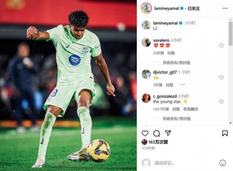 12月5日讯 本轮西甲,巴萨5-1客胜马洛卡。亚马尔一次潇洒的左脚外脚背助攻拉菲尼亚破门。赛后,亚马尔本人也在社媒晒出了这次助攻的起脚瞬间,并配文:L2。