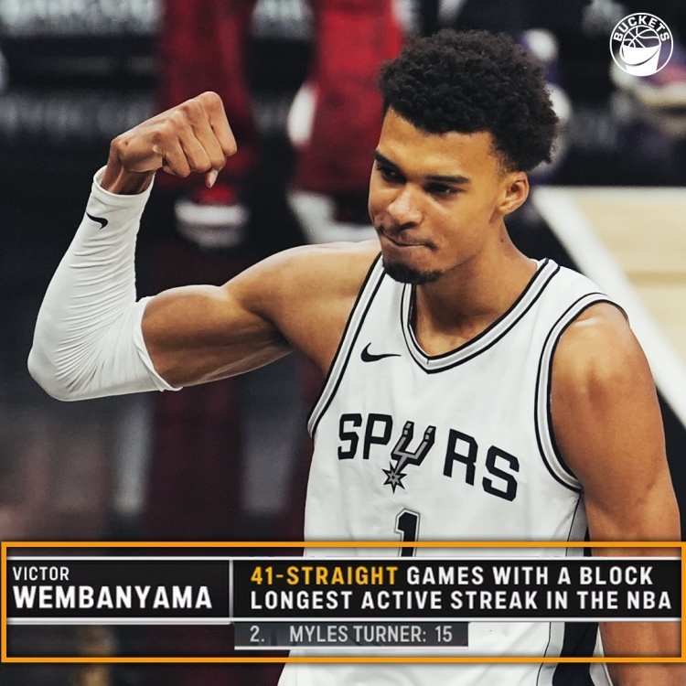 DPOY?文班亚马目前已经连续41场有盖帽入账 联盟现存最多!
