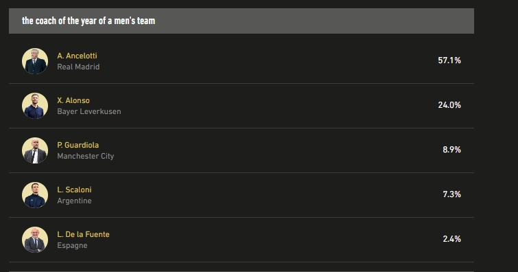 10月05日讯 2024年金球奖颁奖将在本月底举行,官方发起了球迷投票,目前57.1%的球迷将年度最佳主帅投给安切洛蒂。