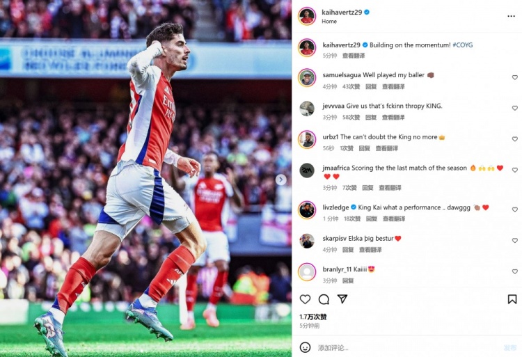 哈弗茨已经连续7场在酋长球场的比赛中破门,他在个人社媒也晒出本场庆祝进球的照片,配文写道:“让我们继续延续这样的势头!”