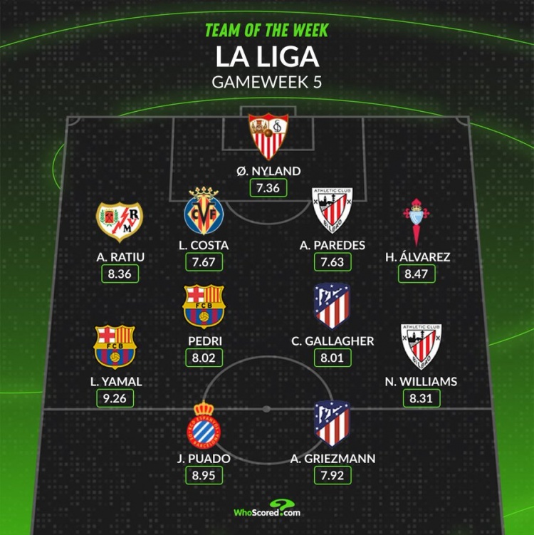 9月17日讯 WhoScored根据球员评分列出了西甲第5轮最佳阵容,亚马尔、佩德里、格列兹曼、加拉格尔在列。