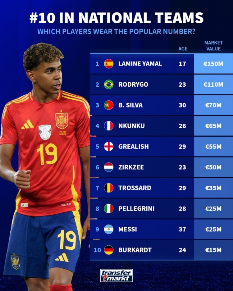 10月12日讯 德国转会市场统计了国家队10号球员的身价,并列出榜单,亚马尔1.5亿欧居首,罗德里戈1.1亿欧排名次席,梅西2500万欧排在并列第8位。