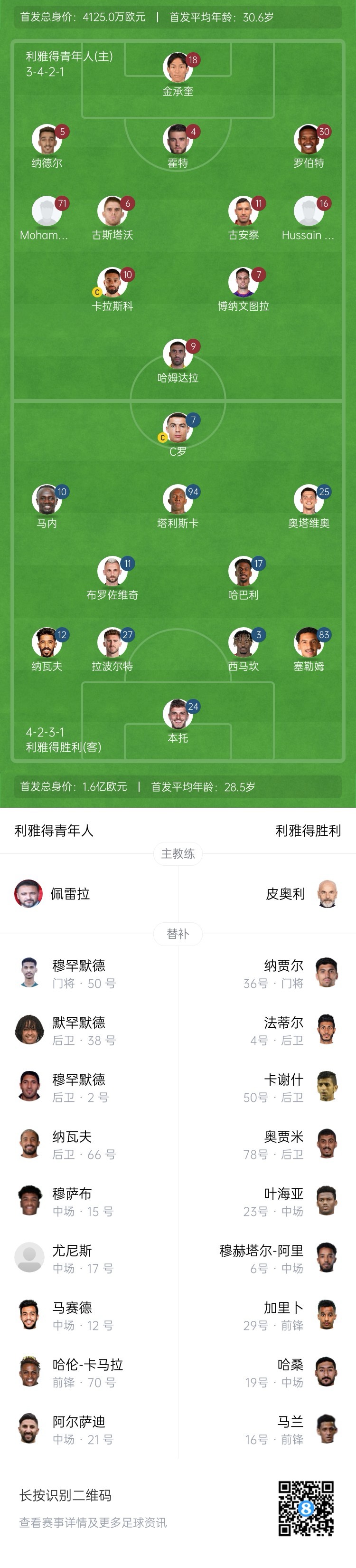 利雅得胜利首发:24-本托、12-纳瓦夫-布沙尔、3-西马坎、27-拉波尔特、83-纳吉迪、17-海巴里、11-B罗、25-奥塔维奥、94-塔利斯卡、10-马内、7-C罗