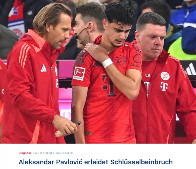 帕夫洛维奇在昨晚对阵斯图加特一役早早伤退,帕利尼亚替补登场。赛后,拜仁方面透露帕夫洛维奇遭遇锁骨骨折,预计伤缺数周。