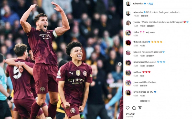 10月21日讯 曼城在本轮英超2-1绝杀狼队,本场队长鲁本-迪亚斯通过社媒晒照庆祝。