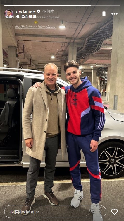 赖斯在社交媒体上晒出与阿森纳名宿博格坎普在停车场的合照,配文:“很荣幸见到这位传奇,博格坎普。”