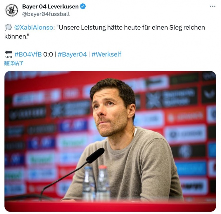 11月2日讯 勒沃库森在本轮德甲焦点战0-0战平斯图加特,药厂全场压制对手但未能破门,主帅阿隆索在赛后接受了采访。
