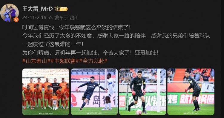 11月2日讯 中超收官战,山东泰山2-1击败梅州客家,最终排名第五,目前球队赶赴韩国备战亚冠比赛。赛后,王大雷更新社媒谈到感想。