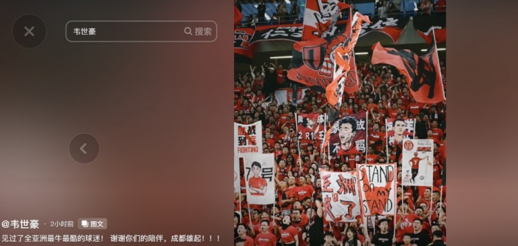 韦世豪在个人社交媒体中写道:见过了全亚洲最牛最酷的球迷!谢谢你们的陪伴,成都雄起!
