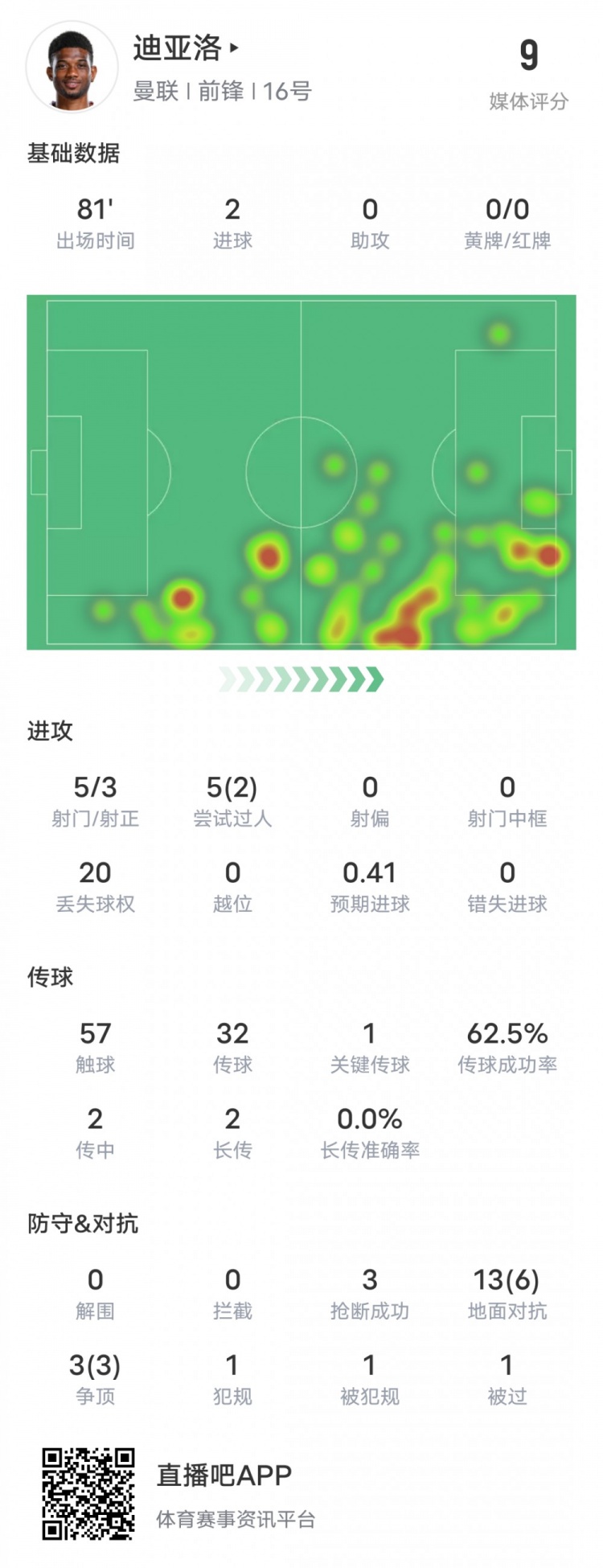 11月8日讯 欧联杯联赛阶段第4轮,曼联对阵塞萨洛尼基,迪亚洛首发出战,打进2球,2次过人成功,送出1次关键传球,但也有20次丢失球权,评分9.0。