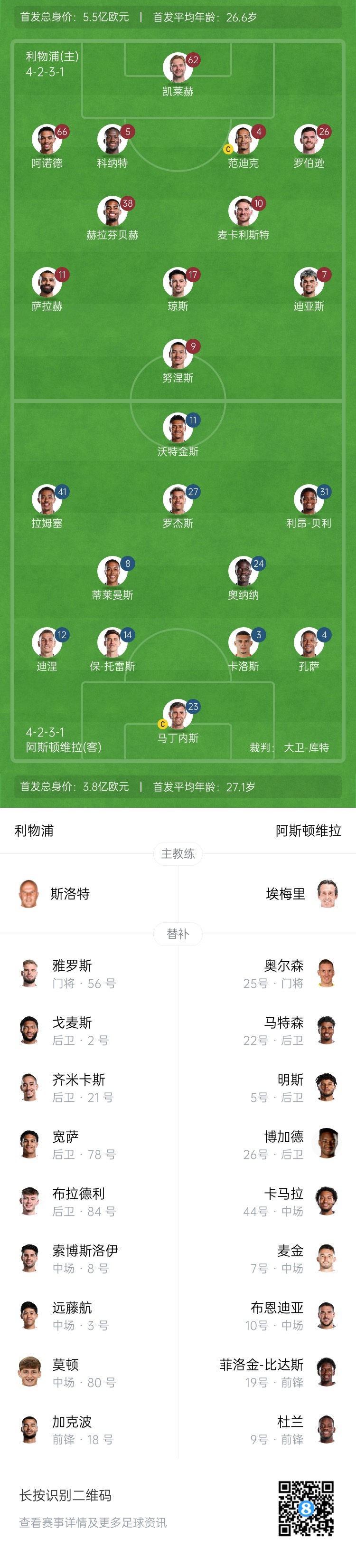 利物浦替补:56-雅罗斯、2-戈麦斯、3-远藤航、8-索博斯洛伊、18-加克波、21-齐米卡斯、78-宽萨、80-莫顿、84-布拉德利