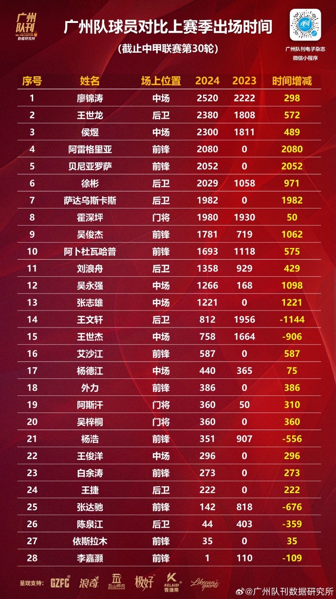 11月11日讯 2024赛季中甲落下帷幕,广州队最后位列积分榜第三位,博主“广州队刊数据研究所”统计了球队队内本赛季中甲出场时间榜。