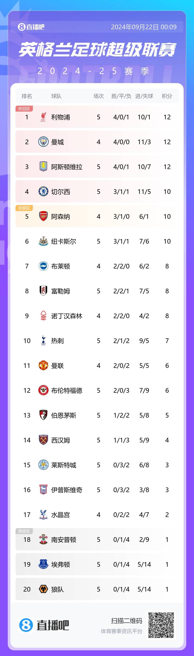 09月21日讯 英超第5轮今晚结束多场争夺,利物浦主场3-0完胜伯恩茅斯,以净胜球优势暂时登顶英超积分榜。最新积分榜如下↓