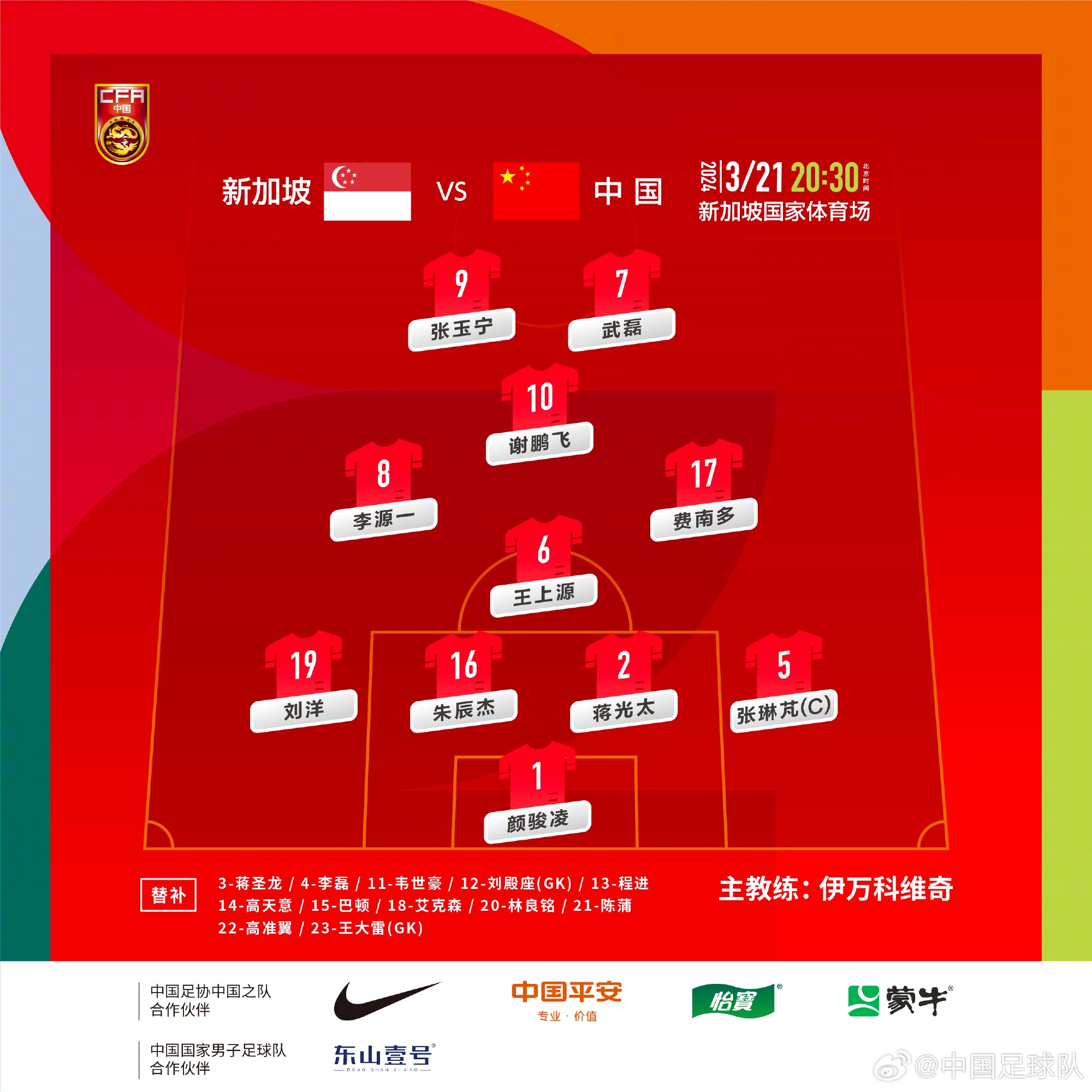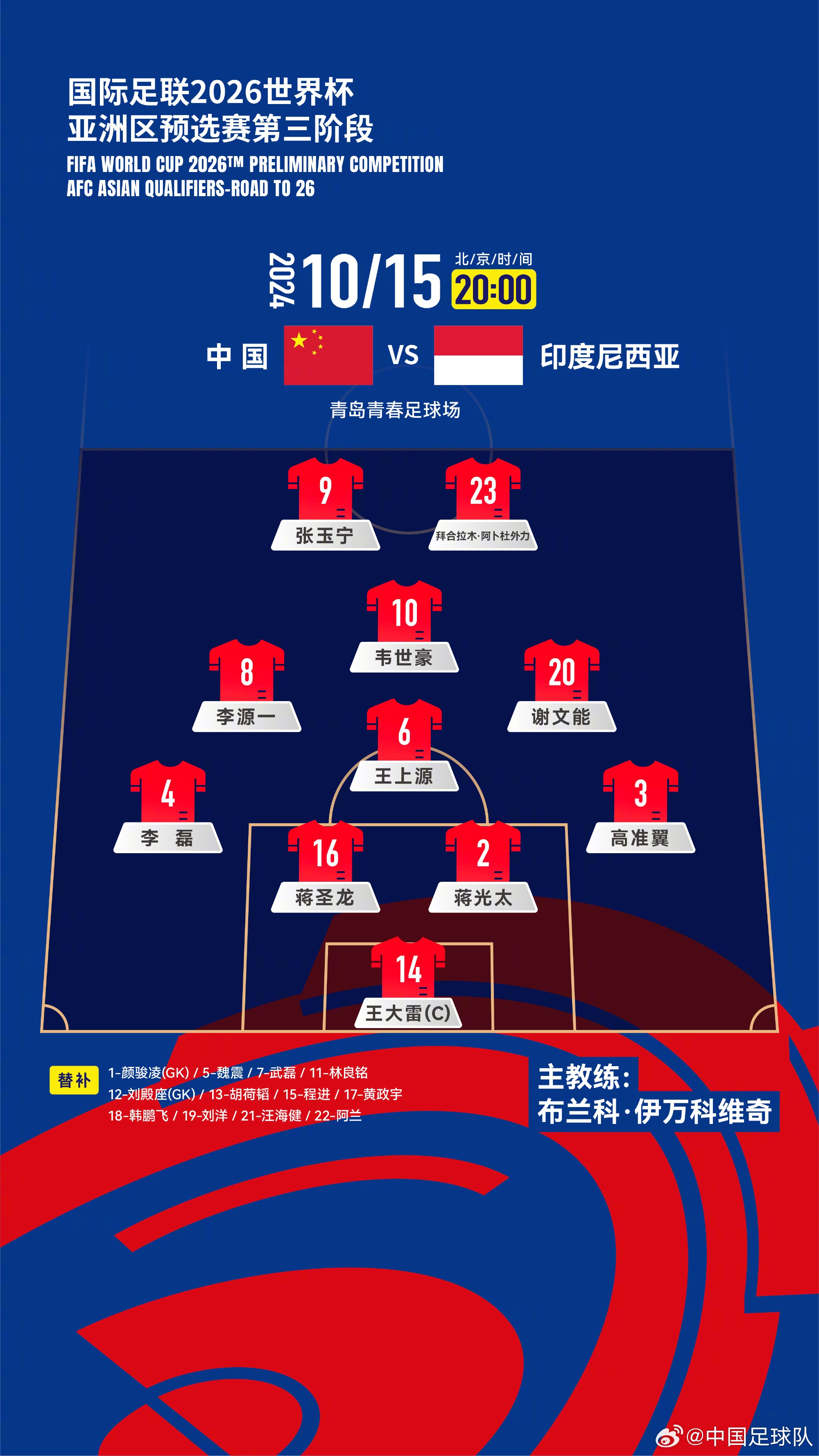 国足客战巴林首发:14-王大雷、4-李磊、5-朱辰杰、16-蒋圣龙、19-杨泽翔、6-王上源、8-李源一、10-韦世豪、11-林良铭、9-张玉宁、23-拜合拉木