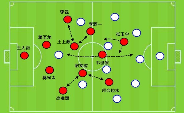 拜合拉木在边路的位置套上接应,他可以去到边路传中,利用自己的活动范围,成为中路支点张玉宁的僚机。