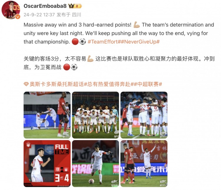 昨晚进行的中超第26轮比赛,海港客场4-3艰难战胜亚泰,此役奥斯卡贡献1次助攻。奥斯卡在社媒晒出比赛照并配文写道: