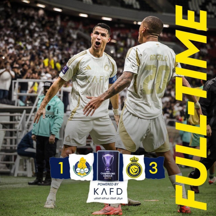 亚冠精英联赛第5轮,利雅得胜利3-1击败阿尔加拉法,C罗双响,胜利暂升第二。