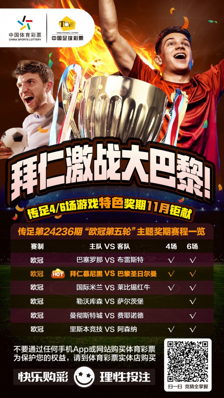第24236期传足4/6场游戏特色奖期已经于2024年11月24日20:00开售,将于11月26日22:00停售,并于11月27日开奖,其中巴塞罗那VS布雷斯特、拜仁慕尼黑VS巴黎圣日尔曼、国际米兰VS莱比锡红牛、里斯本竞技VS阿森纳为4场进球游戏竞猜赛事。