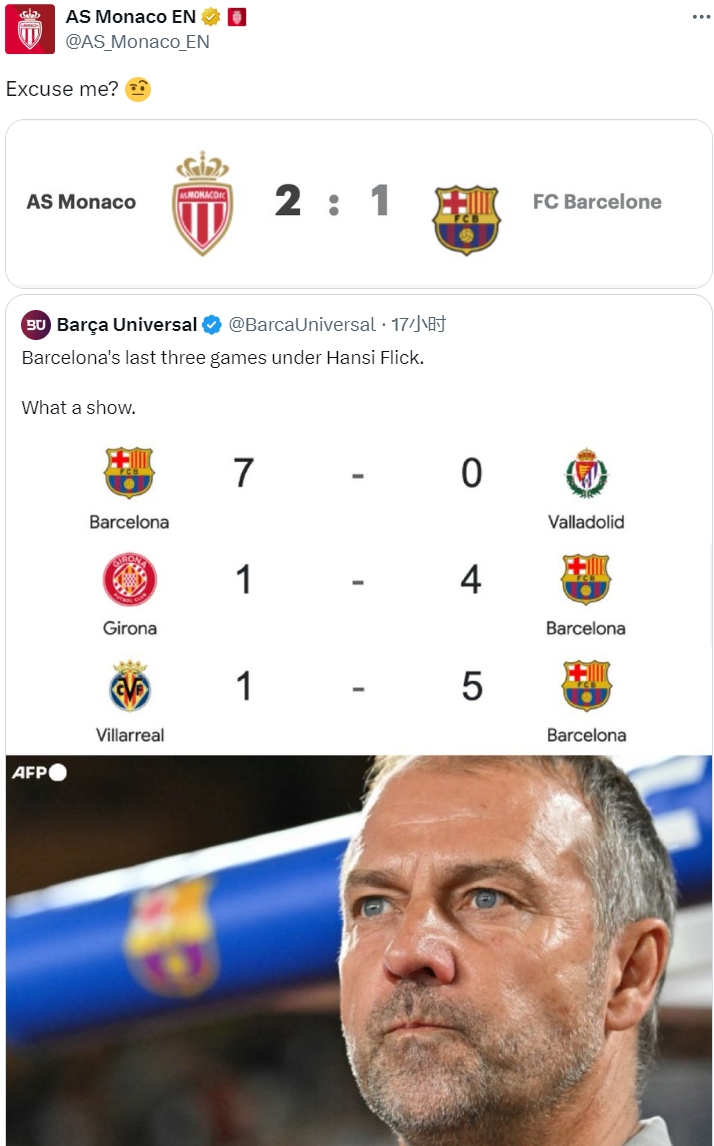 不过图上却少了9月20日巴萨1-2负于摩纳哥的比赛,这一行为也被摩纳哥官推无情拆穿,随即晒出摩纳哥2-1巴萨的比分图,并回复球迷号“打扰一下?