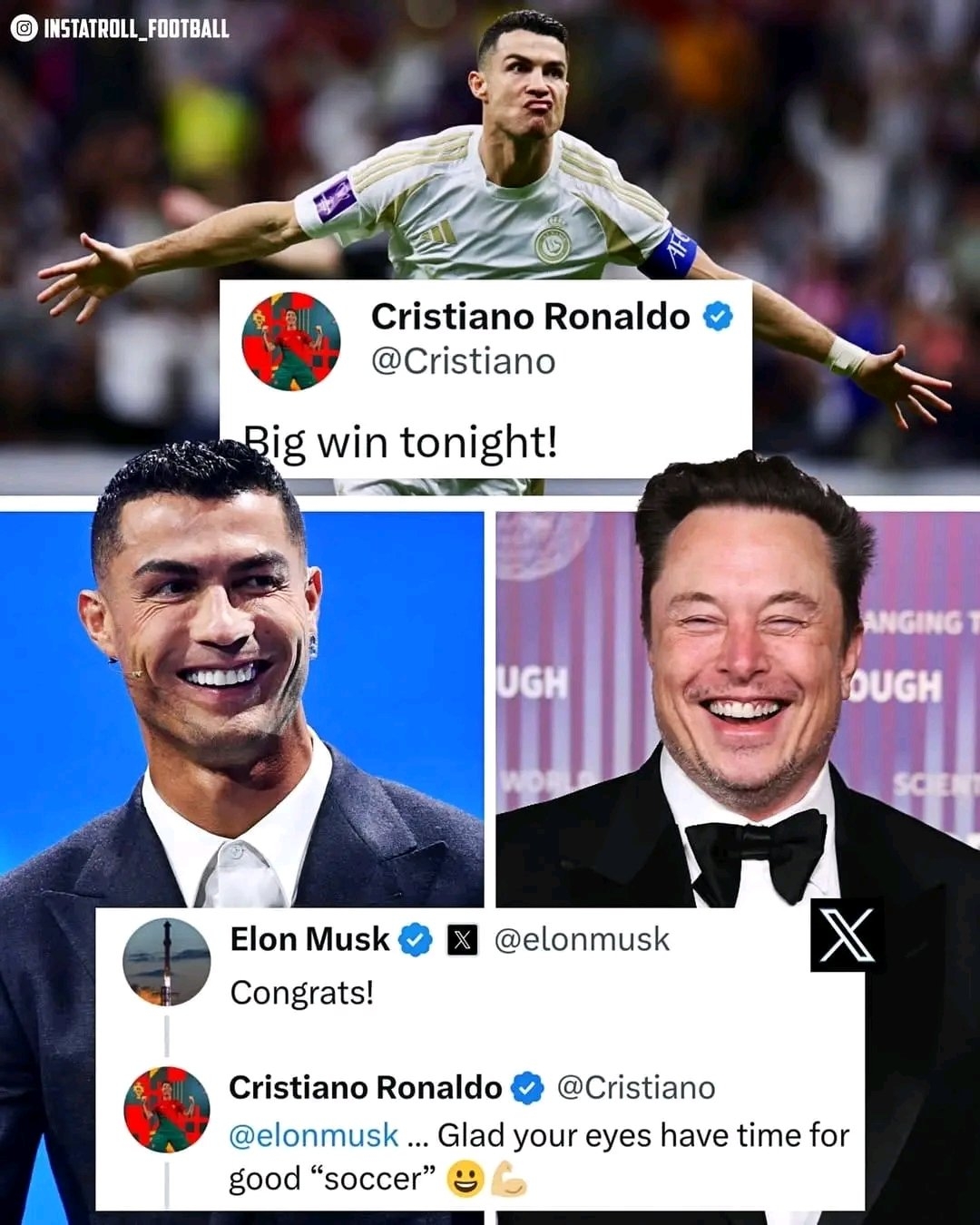 赛后,C罗在X上晒照庆祝球队取胜,马斯克评论祝贺:“恭喜。”