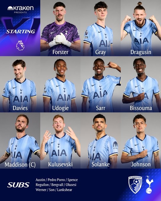 40-奥斯汀、23-波罗、24-斯宾塞、3-雷吉隆、15-贝里瓦尔、64-奥卢塞西、16-维尔纳、7-孙兴慜、42-兰克希尔