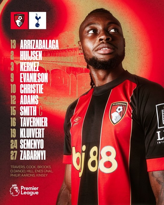 12月6日讯 英超第14轮比赛,热刺前往客场挑战伯恩茅斯。目前,对阵双方已经公布了首发名单,热刺方面索兰克、麦迪逊、布伦南-约翰逊首发,孙兴慜替补。