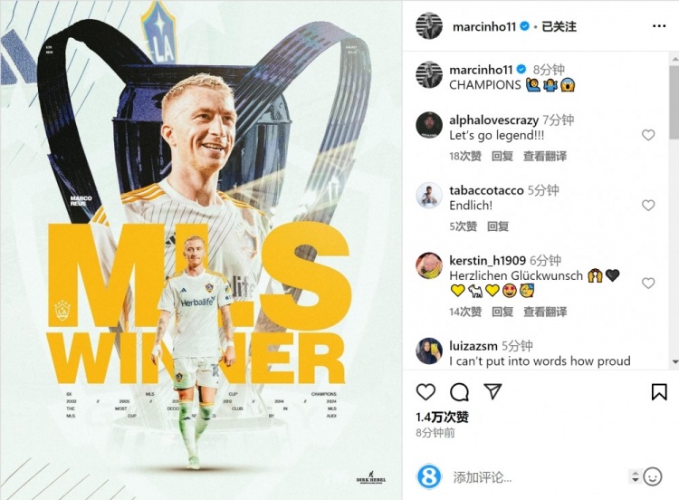 12月8日讯 在美职联总决赛中,35岁罗伊斯替补出场,最终洛杉矶银河2-1击败纽约红牛,捧起冠军奖杯。