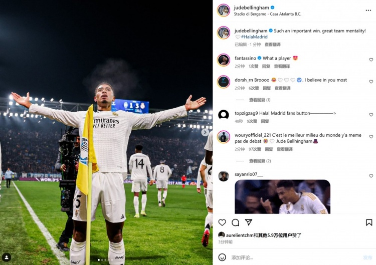 本场比赛贝林厄姆打进近13场欧冠首粒进球,赛后他也在个人社媒晒出自己进球庆祝动作,配文写道:“如此重要的一场比赛,球队展现了很棒的拼搏精神。”