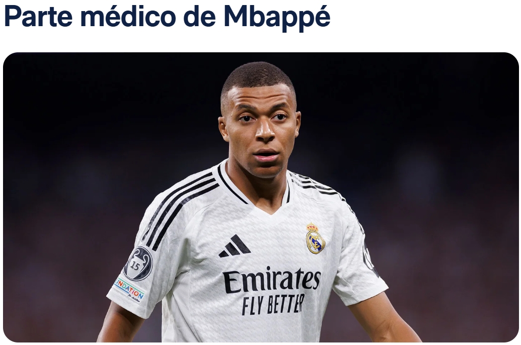 经过今天对我们的球员基利安-姆巴佩进行的测试,皇家马德里医疗服务部门诊断他左腿大腿受伤。恢复情况待观察。