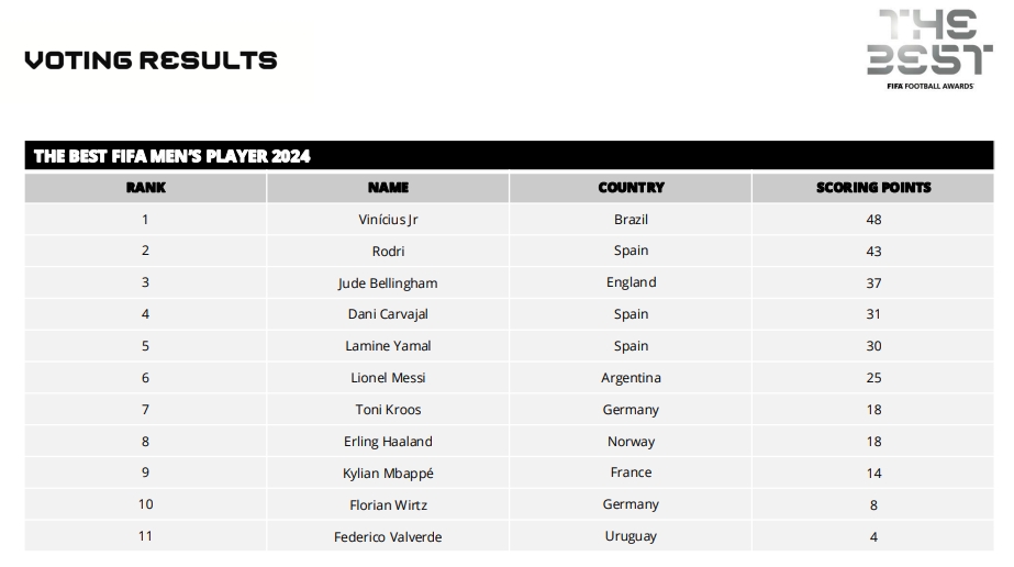 12月18日讯 FIFA年度颁奖典礼结束,维尼修斯当选年度最佳球员(世界足球先生),FIFA官方刚刚公布了得票情况。