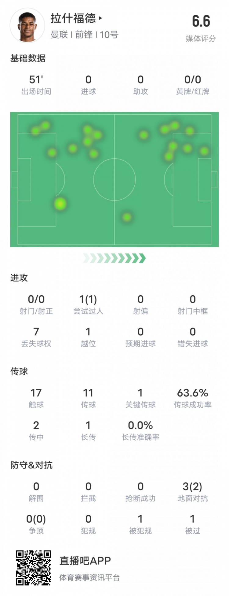 9月30日讯 本赛季英超联赛第6轮一场焦点战,曼联半场暂0-1热刺。曼联前锋拉什福德首发出战,0射门,送出1次关键传球,1次过人成功,还有1次越位,评分6.6。