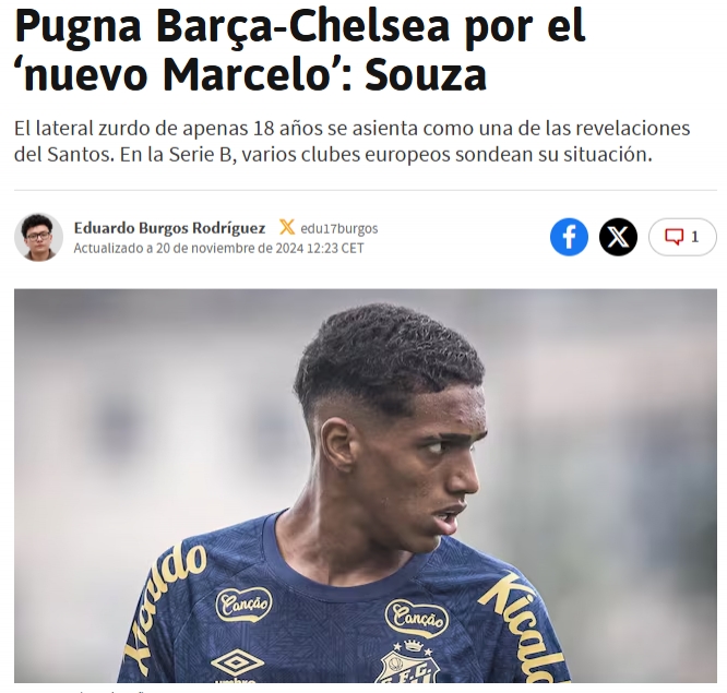 阿斯:巴萨、切尔西有意桑托斯18岁后卫德索萨,球员收到沙特报价